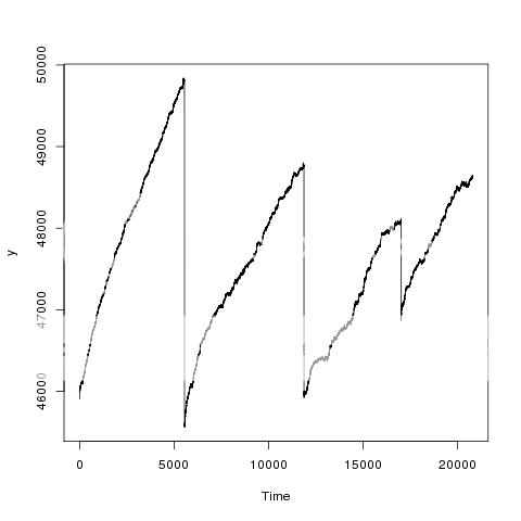 HarryYu 这个图片的解释是,这是四天采集的timeseries数据,大约每天采集5000个点,大于5000或者小于5000,构成x坐标。每个采样点的数值,构成y坐标。 这个图形直观上很容易看出规律,但是我用arima预测的话,预测出来的曲线,根本不能满足我的想法。预测出来的不是一条大概的倾斜的直线,而是一条很离谱的水平线。比如预测4000个点,预测结果是4000个大体相等的y值。 查了一下arima.pdf里面的介绍,应该为观察数据指定frequency。比如,我对每天的数据划分为300份,frequency=300(frequency=4000的话,会超出内存)。这样做的话,数据是有损失的。这是一组很敏感的数据,一旦采样完成,希望把每个采样点的数据都纳入程序处理。 这个问题困扰了我很长时间,特地发出来,征求大家的帮助。